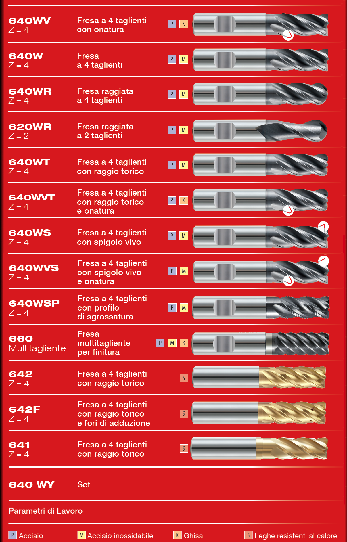 Le geometrie, il materiale base e i rivestimenti sono stati sviluppati specificatamente per tre grosse famiglie di materiali metallici.